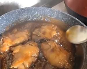 等到鸡腿那面也金黄,倒入准备好的照烧料汁,中小火同时勺子不停舀料汁淋在鸡腿上,到出锅鸡腿都不用翻面了。