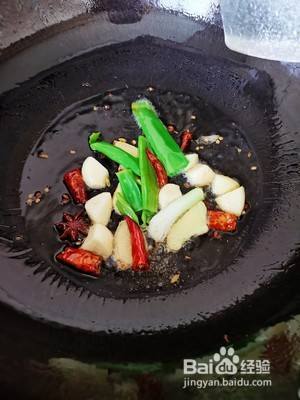 锅中倒入油烧热,加入除青椒、冰糖以外的所有佐料,翻炒出味。