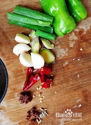 备齐佐料——葱、姜、蒜、八角、干辣椒、花椒、茴香、冰糖、青椒。
