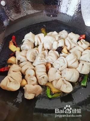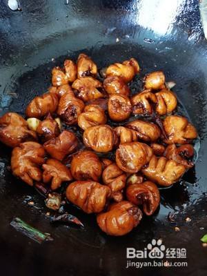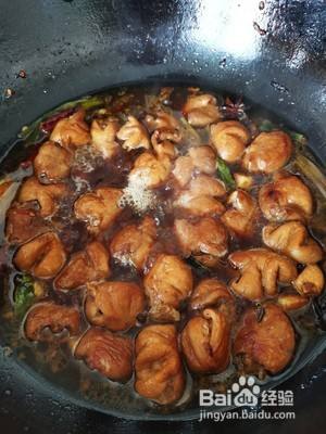 翻炒上色后加入凉水,漫过大肠即可,大火烧开,加入适量的盐,转入小火慢炖30分钟。