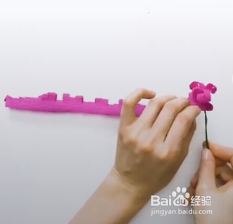 皱纹纸剩下最后一部分不动,然后抽出竹签,手指固定皱纹纸。