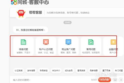 5、进入“58同城客服服务中心”后,选择需要咨询问题的类型,并向客服描述情况,客服会根据您的发布内容进行判断是否进行解封处理!