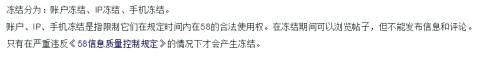 2、冻结分为:账户冻结、IP冻结、手机冻结。账户、IP、手机冻结是指限制它们在规定时间内在58的合法使用权。在冻结期间可以浏览帖子,但不能发布信息和评论。只有在严重违反《58信息质量控制规定》的情况下才会产生冻结。