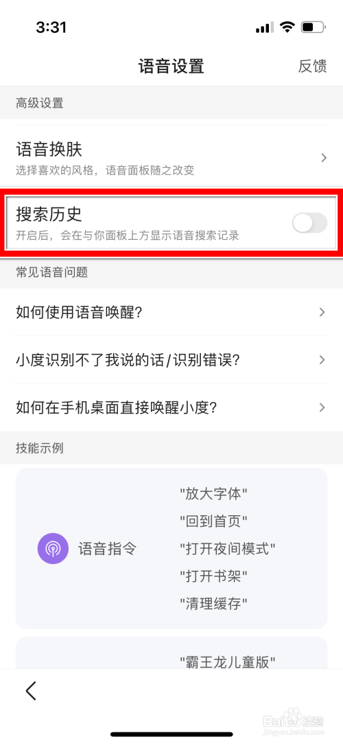 打开按钮,即可允许在面板上显示语音搜索记录。