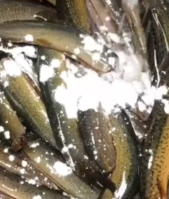 泥鳅清理干净,放盐、鸡精、味极鲜、蚝油,拌匀,放淀粉,拌匀