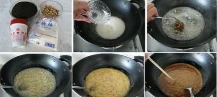 如果还有些软,就再继续熬制一会,如果已经变脆就立刻倒入芝麻和核桃;