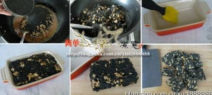 将芝麻、核桃和糖浆充分伴匀后,盛入涂过油的模具中,并用勺子压压紧;