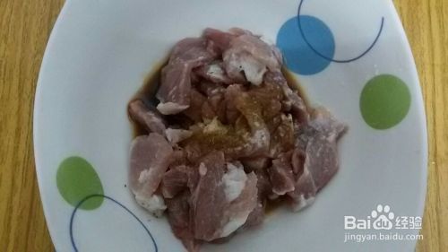 瘦肉用地瓜粉、盐、胡椒粉、酱油腌制两分钟,用筷子搅拌均匀。