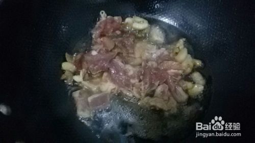 锅中放油,把肥肉放进去榨,榨干之后放入腌好的瘦肉,炒至变色之后盛出来。