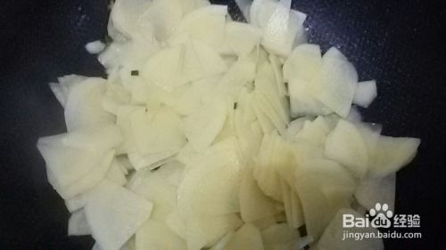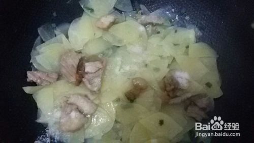 不断翻炒土豆片,期间加入少量水炖煮,就成熟时把肉放进去,加入食盐味精炒,翻炒均匀即可出锅。