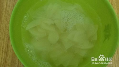 在弄好的土豆片里面加入适量的水,不加水会有淀粉而且容易变黑。