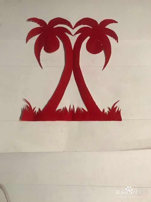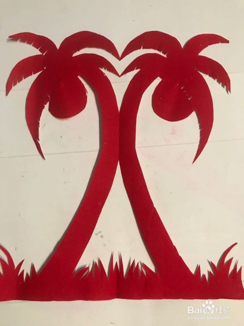 第六步 剪完外围多余的彩纸之后 再剪椰子树大叶子 还有果实 椰子 以及下边的小草部分 然后再修边整理 都剪完之后 展开压平 两颗简单漂亮的椰子树就裁剪完成了