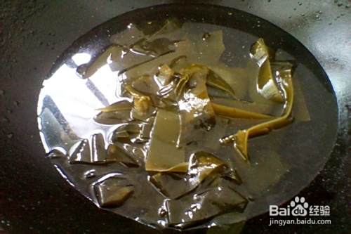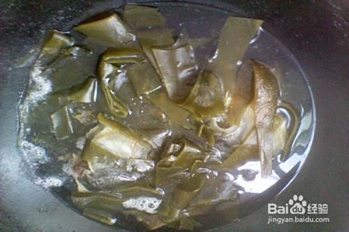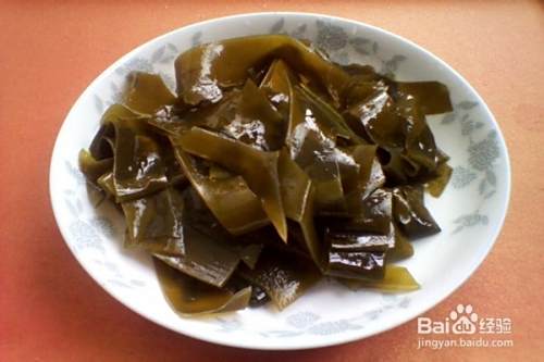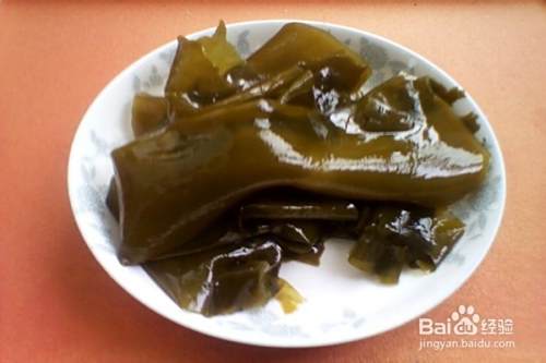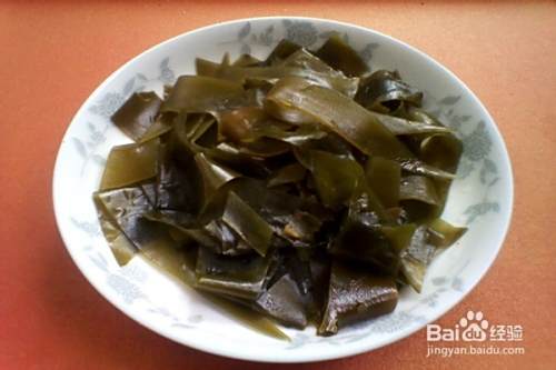 在锅中的水再次烧滚的时候,把海带从锅中捞起,放在盘中。