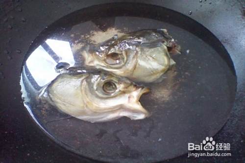 然后,在锅中加入200ml左右的水,把鱼头放入锅中,盖上锅盖,继续加热。